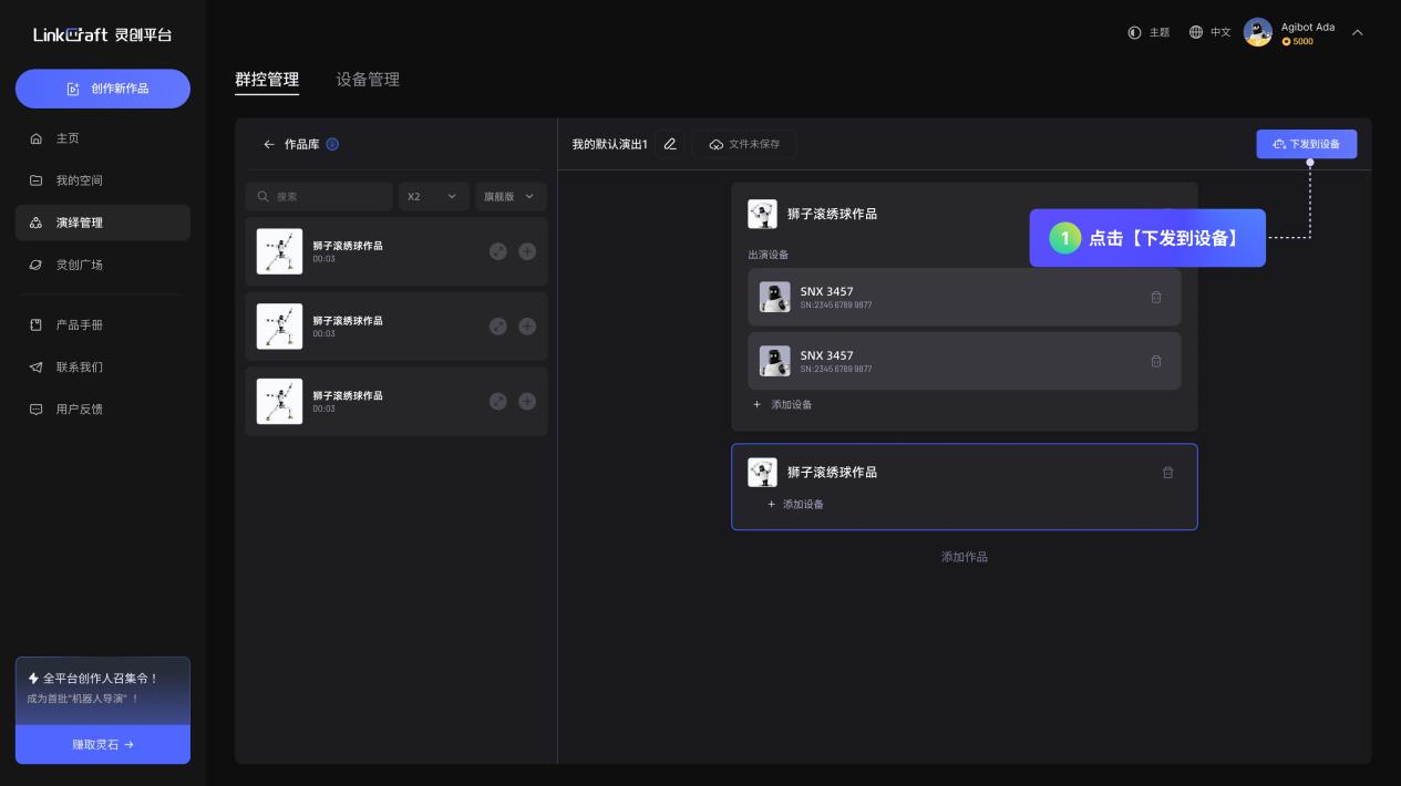 「演绎管理」:内含「设备管理」和「群控管理」两部分功能。「设备管理」用于查看机器人信息,绑定和管理机器人设备;「群控管理」用于创建并管理多设备同步的演绎任务,实现多台机器人协同表演或批量控制。